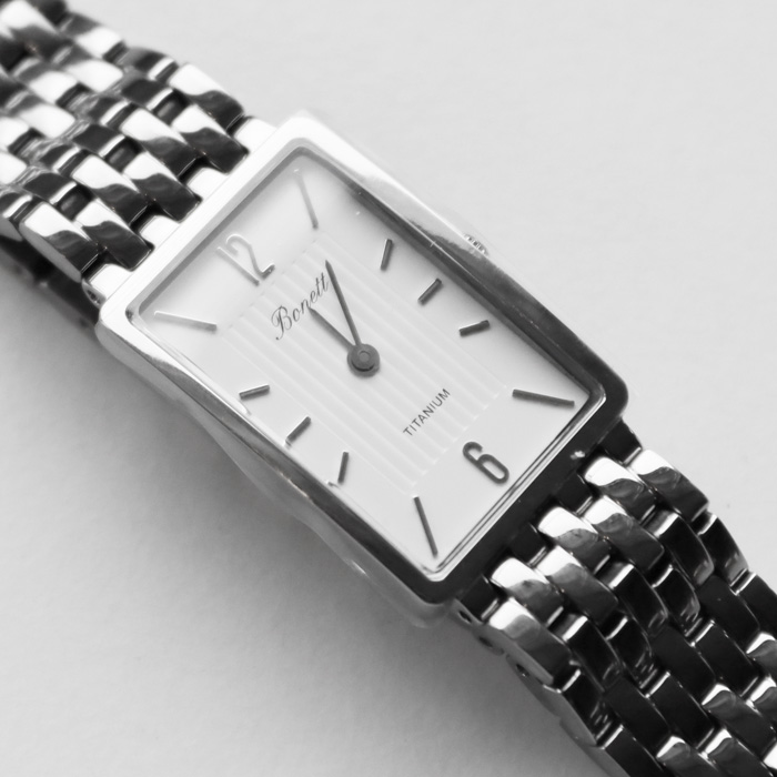 - Flott damuur úr titanium við fýrakantað urskivu, leinkjureim og 2 vísarum frá Bonett.