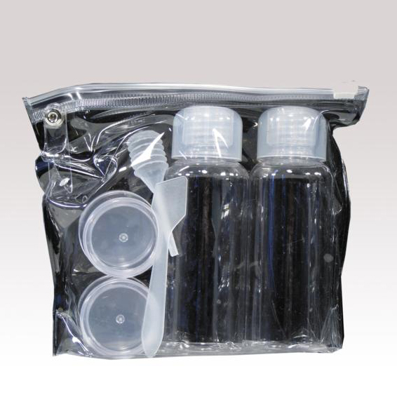 Ferðasett við tómum íløtum, sum tú kann koyra tínar yndishárrøkt og -húðrøkt vøru í.