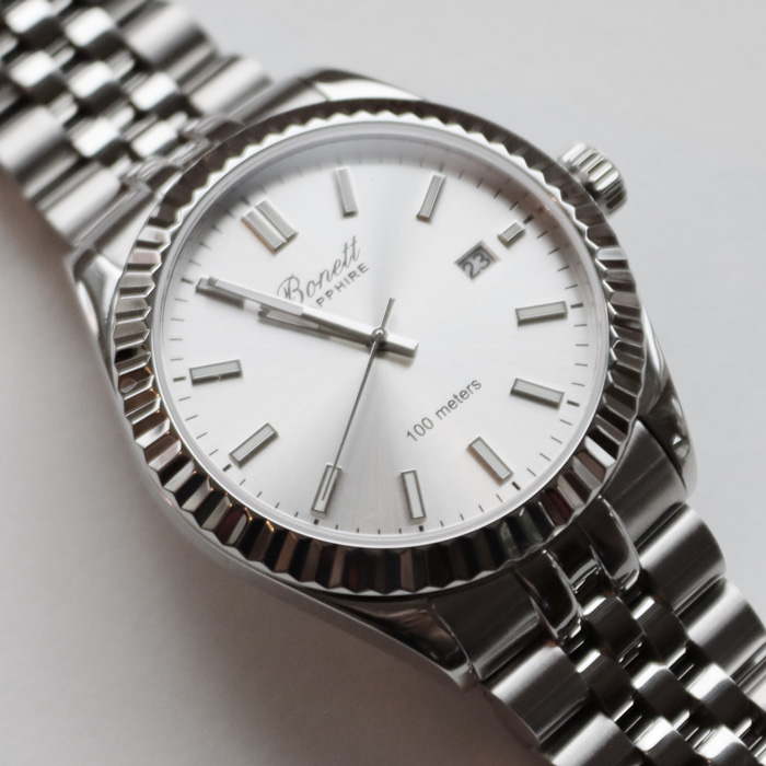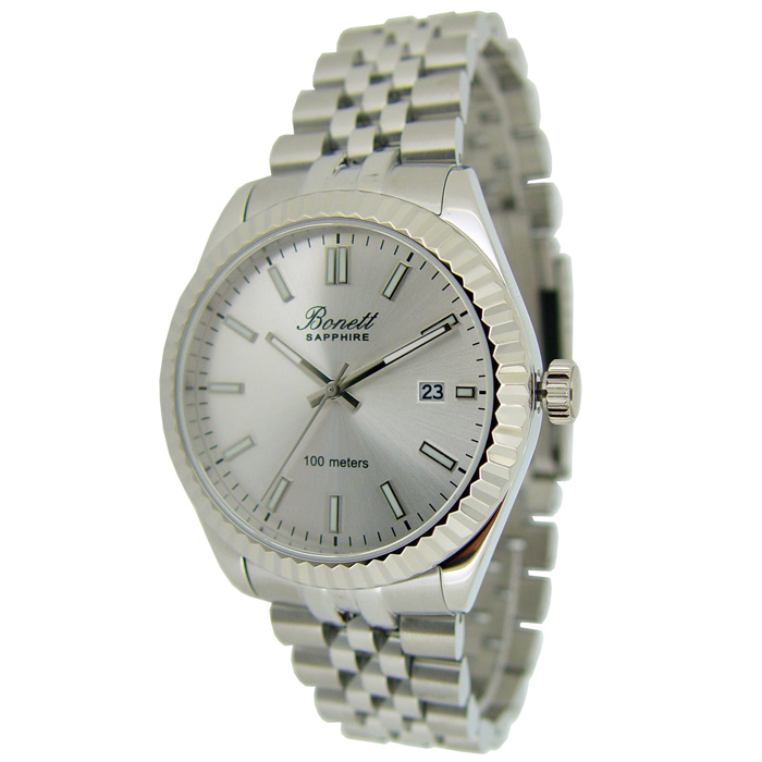 - Flott harraur við silvurlittari urskivu, leinkjureim, 3 vísarum og dato frá Bonett.