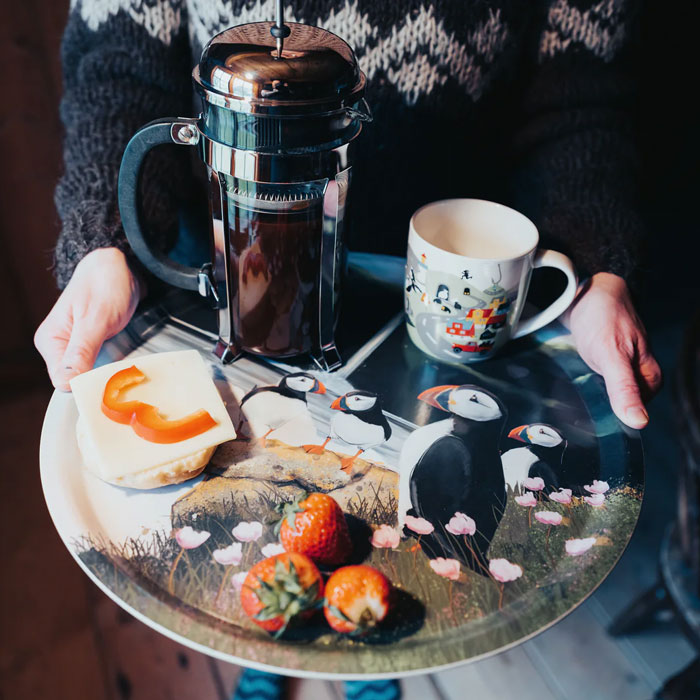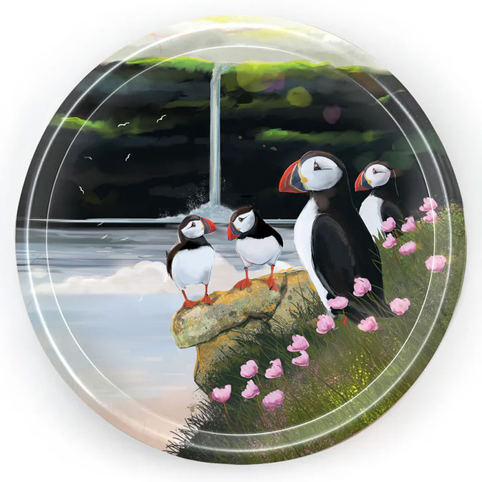- Vakur rundur serveringsbakki við motivinum ‘Lundar’ frá FJORD by Suffía Nón.