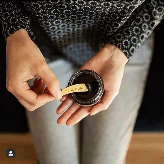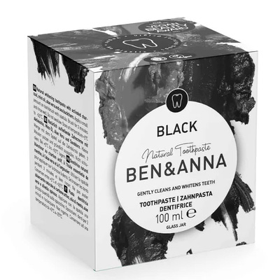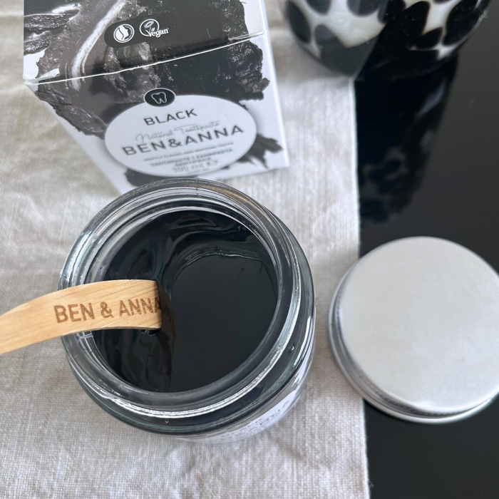 - Svart náttúrligt tannkrem uttan fluoride í krukku frá Ben & Anna, gott til tá tú vil hava hvítari tenn.