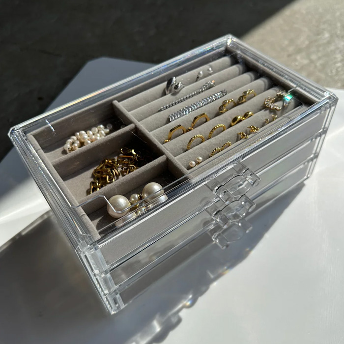 - Smart smúkkuskrín úr plexiglas við 3 skuffum og velourbakkum frá &Copenhagen.