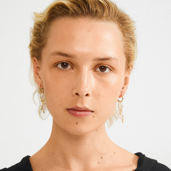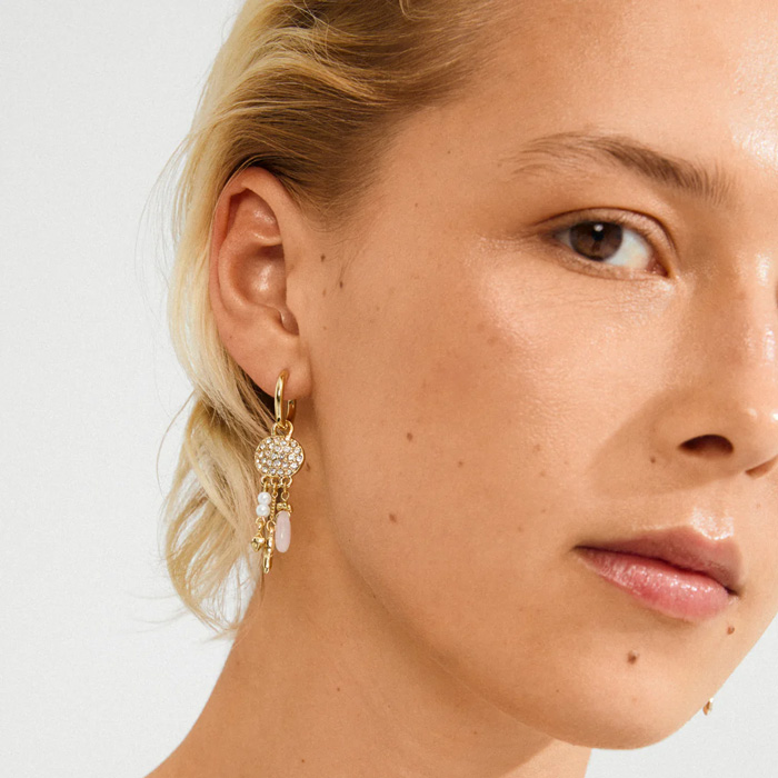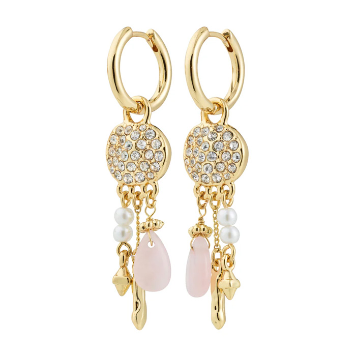 - Gandakendir hoops oyraringar við smáum myntum, rósu kvarts steinum, glasperlum og glitrandi Preciosa krystallum frá Pilgrim.
